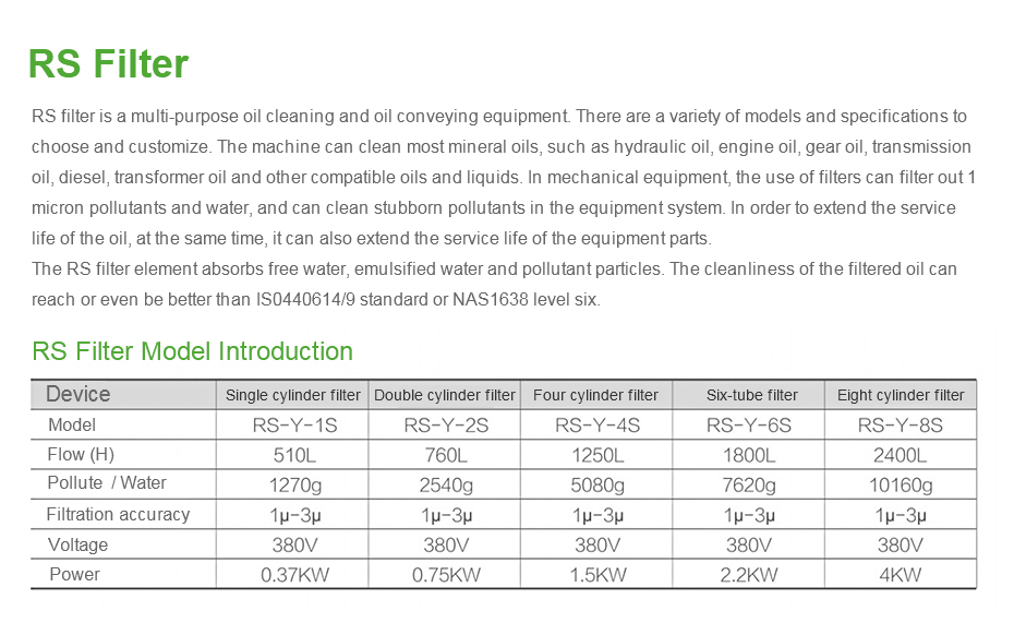 RS filter is a multi-purpose oil cleaning and oil conveying equipment. A variety of models and specifications are selected and customized. The machine can clean most mineral oils, such as hydraulic oil, engine oil, gear oil, transmission oil, diesel oil, transformer oil and so on. On mechanical equipment, the use of filter can filter out 1 micron of pollutants and water, and clean the stubborn pollutants in the equipment system. To prolong the service life of oil and equipment parts. RS filter element absorbs free water, emulsified water and contaminated particles. The cleaning of filtered oil can reach or even better than is04406 14 / 9 standard or NAS 1638 grade VI.